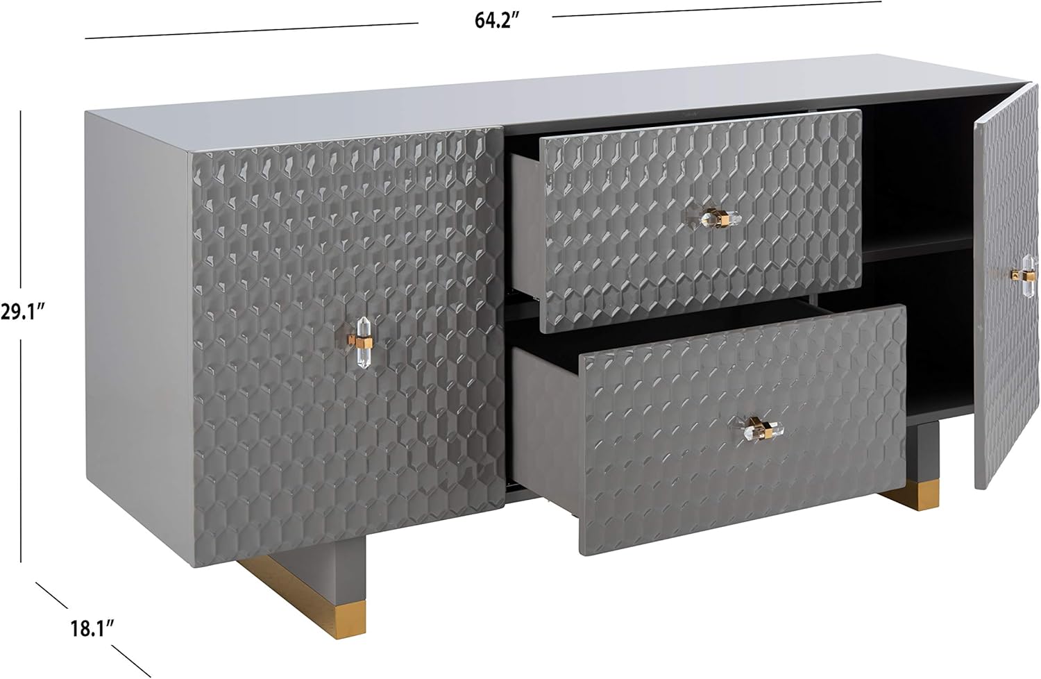 Dynamic and sculptural, this luxurious contemporary sideboard is a modern heirloom. Designed to showcase its stunning raised MDF wood pattern, Its neutral grey hue blends into any dining room décor. Bold gold and brass finishes make it a designer favorite.