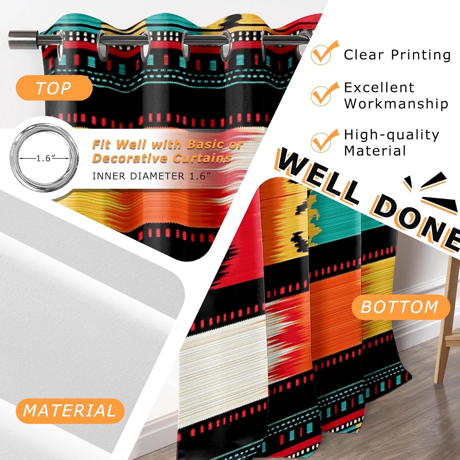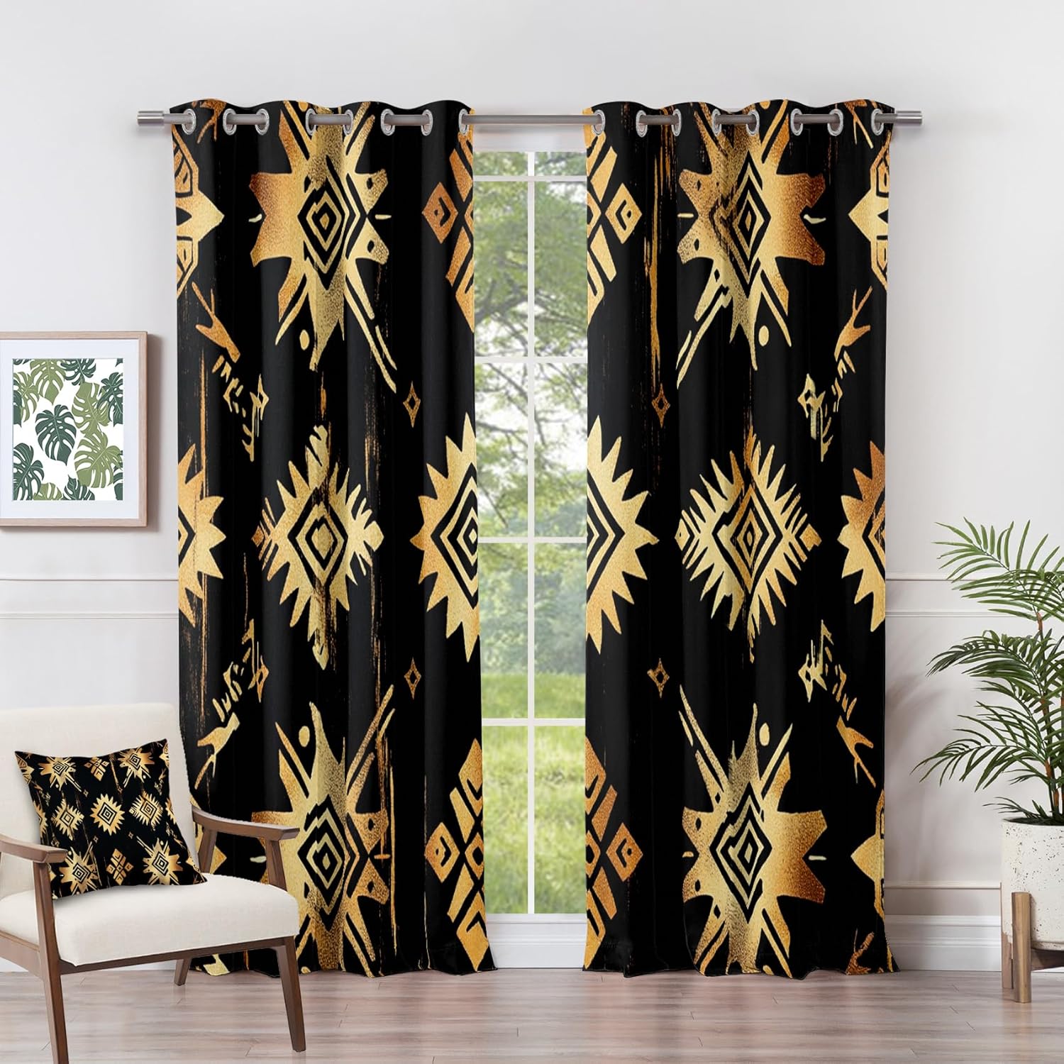 Refresh your space with art and functionality Our printed blackout curtains are the perfect blend of artistry and functionality to complement your home decor. Each curtain features an exclusive pattern designed by a textile artist and printed using advanced digital technology to keep it looking fresh for years. From modern geometrics to nature-inspired patterns, from modern minimalist to elegant vintage styles, we have an extremely wide range of patterns to choose from. Act now! Decorate your home with art. Ultimate comfort, crafted with craftsmanship Light blocking: Triple weave technology, 100% thick polyester outer layer, with black silk lining to block 80-85% of light Temperature control: Insulates in summer and winter, saving energy costs Sound insulation: Create a quieter environment, perfect for light sleepers and home offices Privacy protection: Close the curtains to enjoy your own private space Thoughtful details, easy life Pre-made eyelets: Delicate silver metal rings (1.6 inches inner diameter) can be used on various curtain rods, and installation is simple and quick Premium fabric: High-quality polyester fabric has a great drape and is not easy to wrinkle or wear Multiple sizes: We offer a variety of curtain sizes commonly used in American homes. If you need custom curtain sizes, please consult customer service before purchasing. Your satisfaction, our commitment We are committed to meeting the needs of our customers. Just one email to contact our customer service, we will wholeheartedly help you choose the size and solve all pre-sales and after-sales problems.