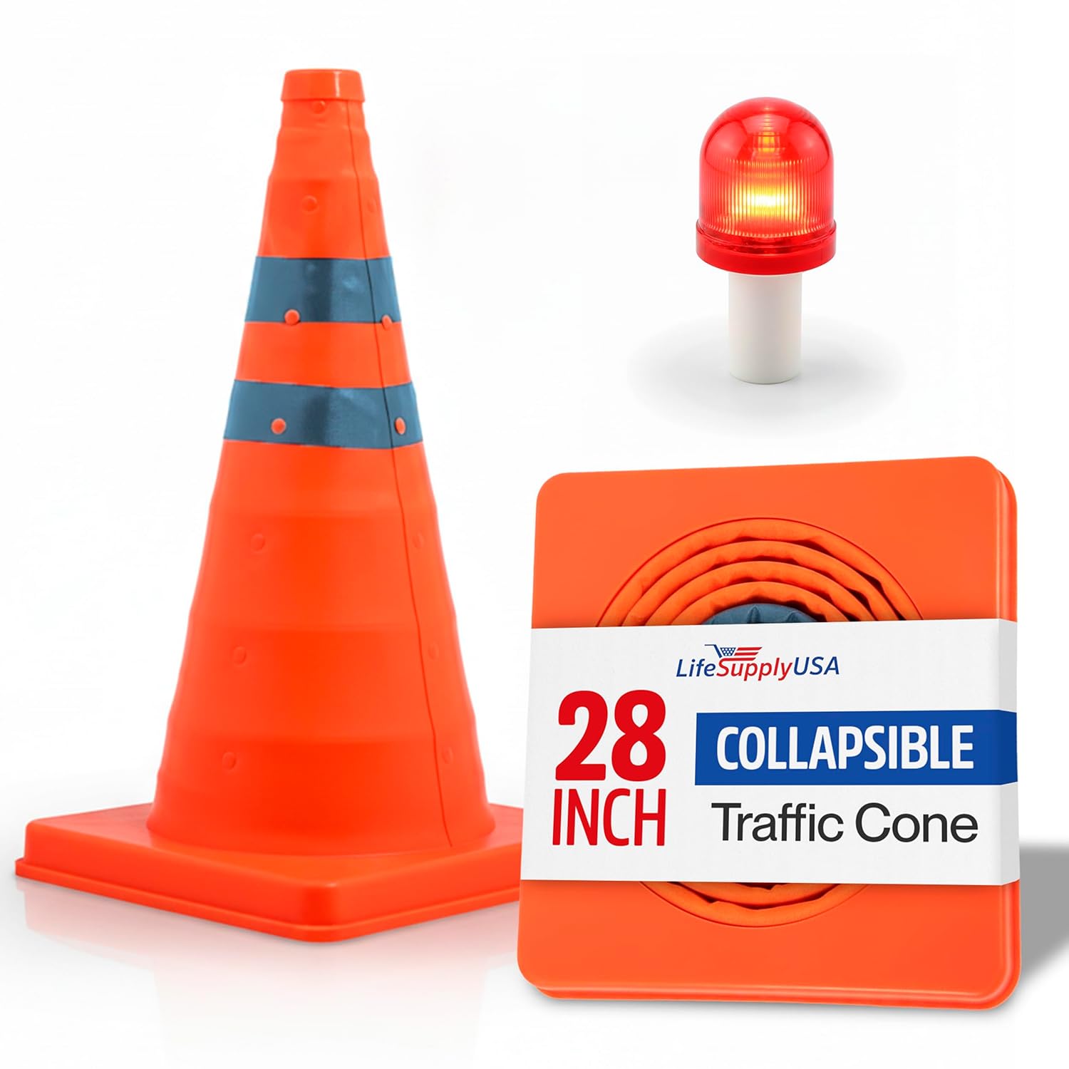 Stay safe and visible in any situation with the LifeSupplyUSA 28" Collapsible Traffic Safety Cones. These bright orange, multipurpose cones are designed for easy visibility with reflective strips that stand out day or night. The collapsible design allows quick setup for emergencies, construction work, road maintenance, or directing parking at events, and can be easily stored when not in use.Constructed from durable, weather-resistant materials, these cones are suitable for both indoor and outdoor environments. Measuring 28 inches in height, they provide effective visual warning while maintaining a compact and portable form. The reflective bands enhance visibility from a distance, ensuring they remain noticeable in daylight or low-light conditions.This collapsible cone set is convenient for keeping in your vehicle for roadside emergencies, in your garage for driveway projects, or at a work site for added safety. Their portable size and foldable structure make them easy to store in a trunk, toolbox, or storage area. Be prepared for unexpected situations with these versatile and reliable safety cones.Height: 28 inchesColor: Bright orange with reflective stripsDesign: Collapsible and portable for easy setup and storageMaterial: Durable and weather-resistant for indoor or outdoor useUse Cases: Ideal for road safety, construction, parking control, and emergency response