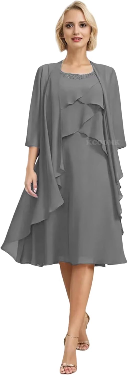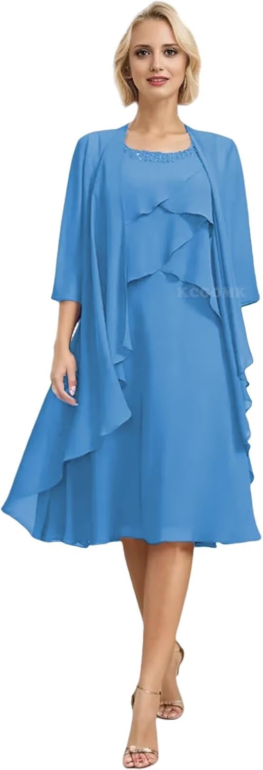 Welcome to KCGOMK2 Pieces Mother of The Bride Dresses for Wedding,3/4 Sleeves Mother of The Groom Dresses for Women,Tiered Grandmother Bride/Groom Dress with Jacket,Beaded Jewel Prom Party Cocktail Dresses for Women,Chiffon Wedding Guest Dresses for Guest,Knee/Tea Length Formal Evening Gowns for Wedding Guest,A-Line Grandmother of The Bride/Groom Dresses for Women Elegant ClassyTiered Tea Length Mother of The Bride Dresses with Jacket 2 Pieces 3/4 Sleeves Chiffon Mother of The Groom Dresses for WomenFabric: ChiffonSilhouette: A-LineNeckline: JewelSleeve: 3/4 SleevesLength: Knee LengthBack Design: Zipper backFeatures:2 Pieces Outfit,Tiered,3/4 Sleeves,Jewel,Tiered/Layered,Chiffon,A-Line,Knee/Tea Length LengthHow to choose size:Measure your body and compare it with our size chart. If you want a more accurate fit, please send us your measurements as follows:1.Bust:____inch2.Waist:____inch3.Hips:____inch4.Shoulder to floor(with shoes):____ inch5.Shoulder width:____inch